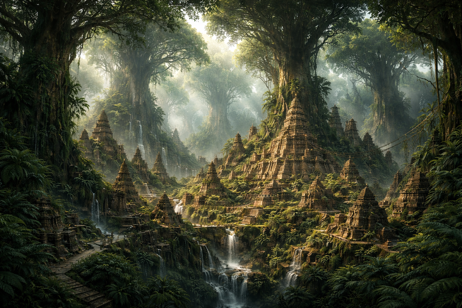 Great stone terraces are woven with living roots, bridges grown from ancient trees, and waterways where scaled beasts glide beside drifting leaves. Animals roam freely through the streets—stags pause at market wells, great cats sleep in the shade of druid towers, and birds nest openly in carved arches of living wood.