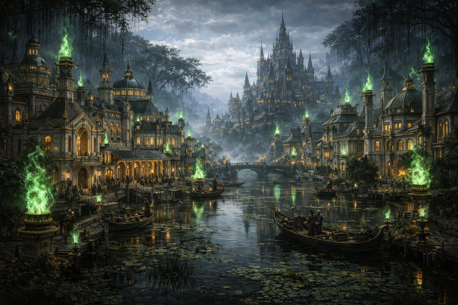 Gormak rises from the black swamps like a half-remembered nightmare—stone towers sinking into mud, lanterns burning with corpse-light, and bridges of bone and iron stretching over stagnant waters.