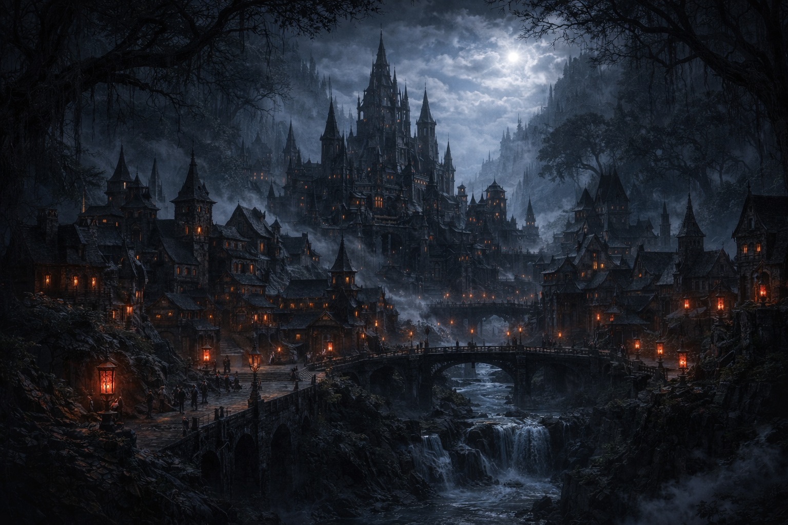 Wrapped in endless black timber and silver mist, the capital of the Ebony Empire stands like a crown of obsidian and moonlight. Spires pierce the canopy, bridges coil between ancient towers, and crimson lanterns glow through the dark—guiding vampires, werewolves, and nightbound citizens alike through streets that never truly sleep.