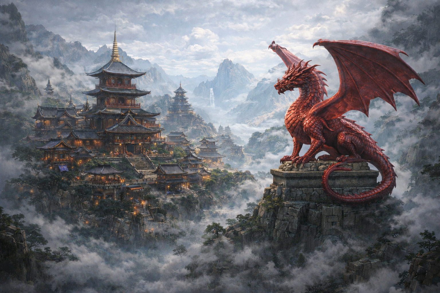 Tieguan is built in ancient Asian design, its tiered rooftops, stone bridges, and curved gates carved directly into the mountain itself. Cherry blossoms bloom year-round along narrow paths and hanging terraces, their petals drifting through the fog like falling embers. Bells ring softly in the wind, echoing through valleys no outsider has ever mapped.