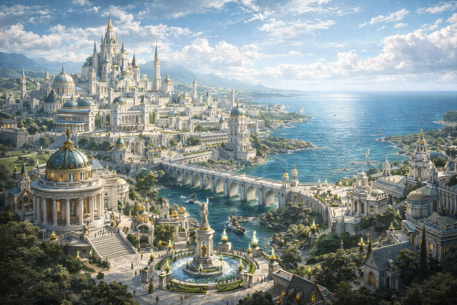 At the heart of Zyltharn stands the City of Calhoun, the official capital of the realm and the axis upon which all trade, treaties, and ambitions turn. White stone avenues stretch outward like spokes of a wheel, linking markets, ports, and embassies that never sleep.