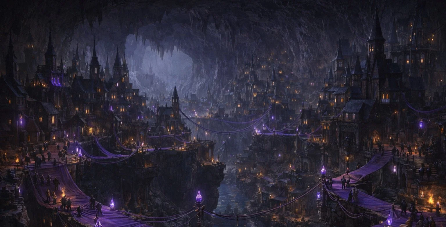 Hidden deep within a colossal cavern, the capital glows with lantern light reflected off black marble walls and crystal veins overhead, giving the illusion of a permanent twilight sky. Its streets are narrow, layered, and alive—crowded with black markets selling forbidden relics, blood-bound contracts, rare beasts, and secrets worth more than gold.