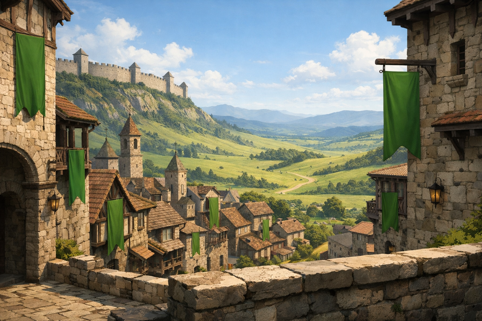 Gilian, the freedom fighter's home front, rises from the rolling plains like a crown set upon green waves. Grass bends endlessly around its stone walls, and soft hills cradle the city as if the land itself chose to protect it.